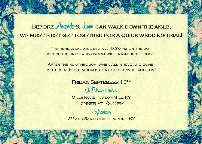 Next are the rehearsal dinner invites. I wanted these to not match the theme of the wedding, and yes, I know about the date problem. It is fixed, and these have not been printed yet. This picture is just our mockup.