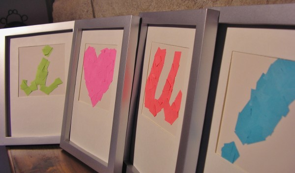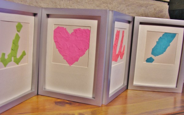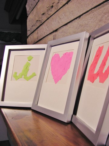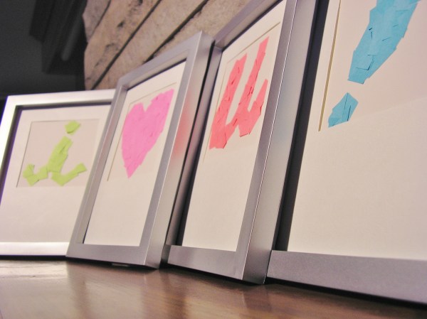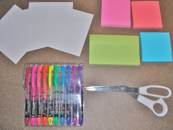 I wanted to find a cute, easy way to dress up a mantle for Valentine’s Day, but I had two parameters: it had to be cheap, and it couldn’t be all pink (yuck lol). Digging through what craft stuff I have easy access to in our current small living space, I dug out two blank 4×6 ivory cards, some post-it notes, highlighters, and a pair of scissors.