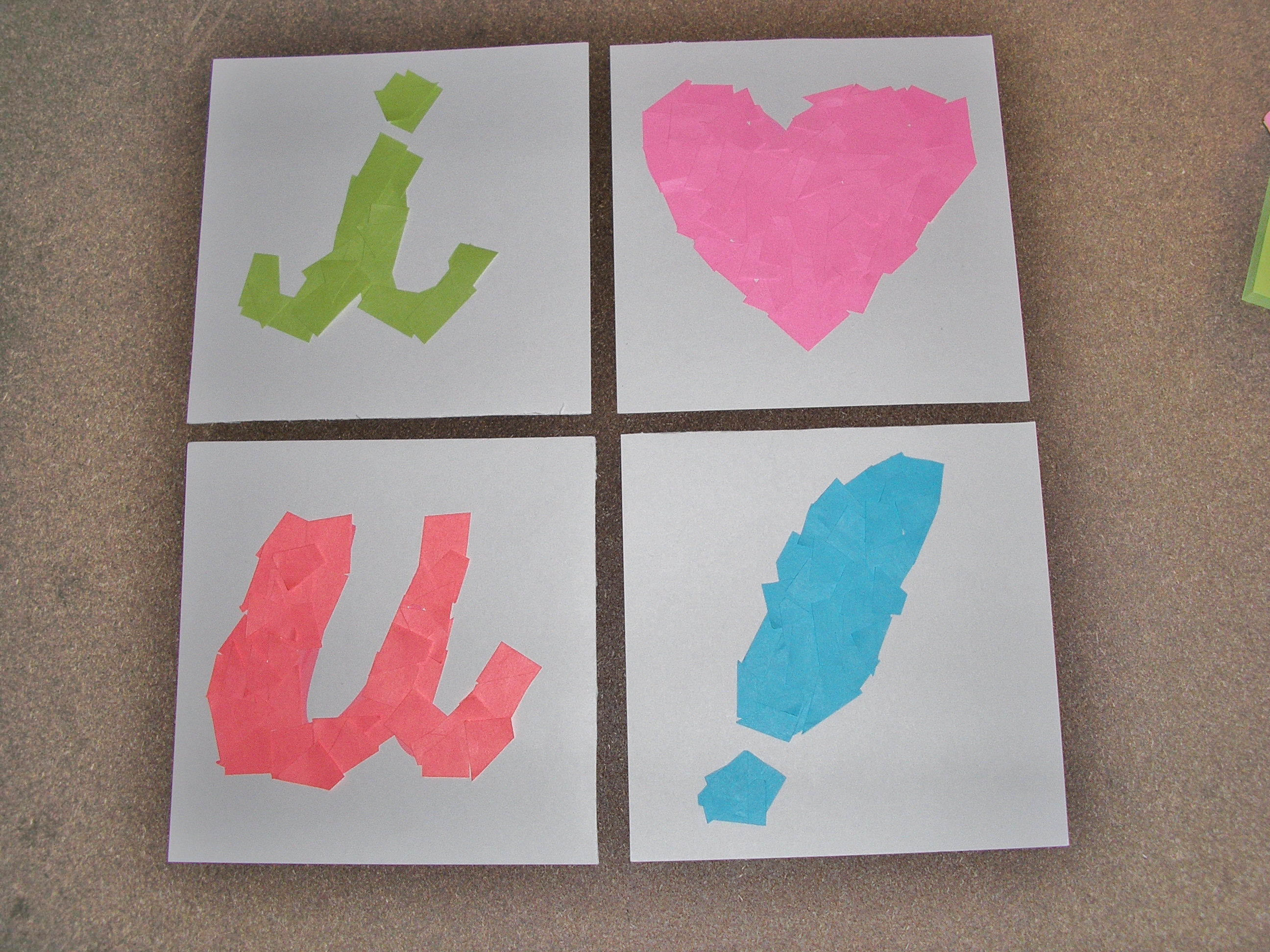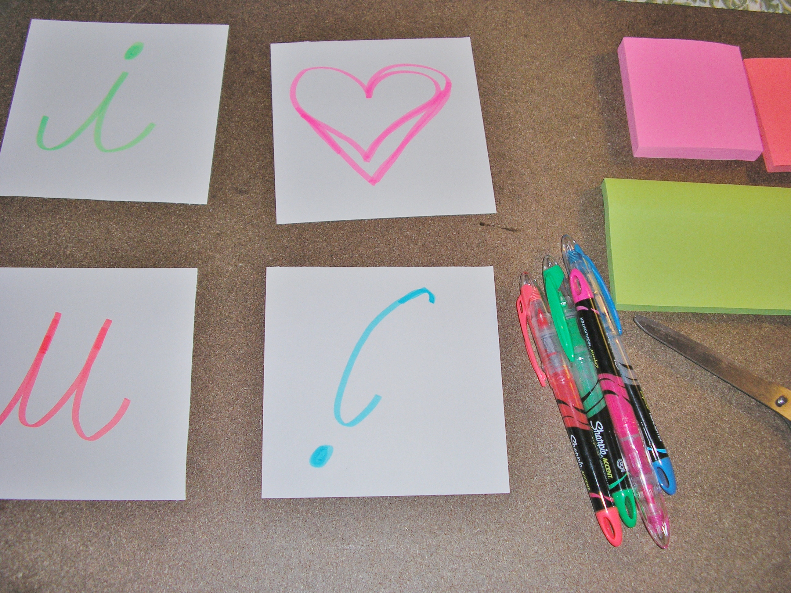 I cut the cards in half on the seam and wrote the letter/symbol that I wanted on each card in a corresponding color to the post-it I wanted to use. Notice that I messed up the heart proportions, but because I was going to cover it up with post-its anyway so it wasn’t a big deal.