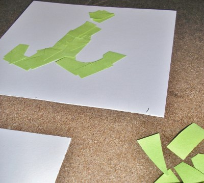 I cut only the adhesive strip of the post-its off and kept the paper-only part to use with pushpins on my bulletin board so it didn’t go to waste. I then cut the adhesive strips into small, irregular pieces of varying sizes and shapes and placed them over the highlighted areas. I tried to make sure that it was as imperfect as possible!