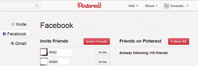 Then, click the red ‘Follow All’ button IF there are names underneath. These are people who have added boards recently. I try to do this about once a week. Note that these are only Facebook friends that are on Pinterest already. The number NEVER matches the actual amount of people or Facebook friends you are following, just an FYI.