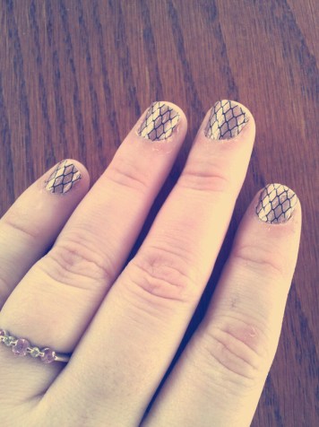 Sally Hansen Salon Effects Real Nail Polish Strips in Misbehaved! They were a little awkward to apply, and I felt like I had all thumbs, but I thought they turned out well. Although, I’m really hard on my fingers (dainty, I am not!) so I painted four clear coats on the top to make sure they’ll stay at least for a few days. The end effect was pretty cool – it seemed like a quatrefoil pattern, but once they were on my nails, it looked more like snakeskin or fishnetting.