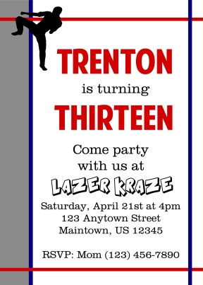 Yes, I have another invitation to share! This one was made for a teenage boy who likes karate, and red, gray, and blue. It’s subtle, which is perfect for a “cool” teenager.
