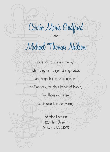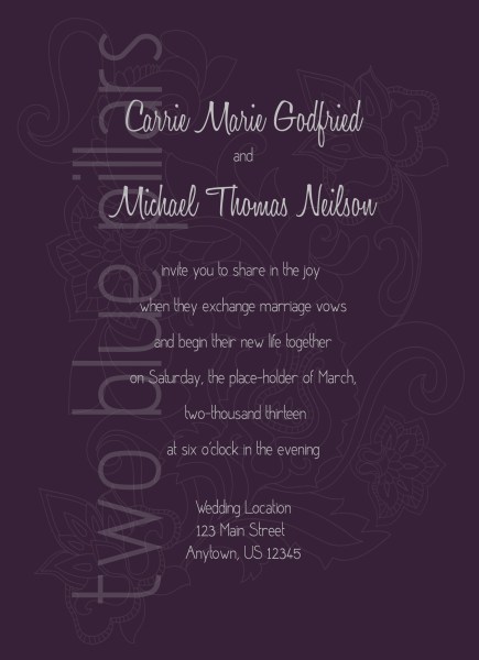 Here’s another, more simple invitation. It includes a solid background with a translucent floral motif and words imposed on top. The colors can be completely custom tailored. Click on the pictures to order the invitations.