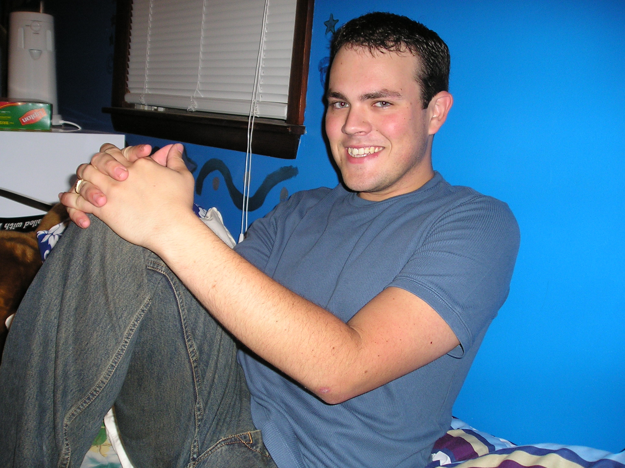 This is one of my favorite pictures of my husband. And yes, my room is blue and purple tiedye. It’s actually come back in style again, haha!
