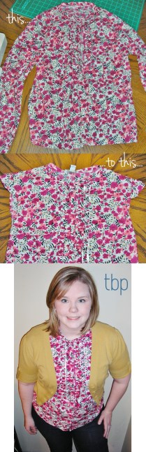 Okay, so anyone who knows me well knows that I can’t sew, or at least I can’t sew well enough for things to hold up. I can fix you up in an emergency (altering bridesmaid dresses on the day of a wedding? check!) but it won’t hold up in the long run. That’s why I’m uber proud of this shirt refashion I did on the cheap, especially because almost a year later, it’s held up better than that store-bought cardigan you see in the picture with it (if I could fit my ginormous preggo belly into it).